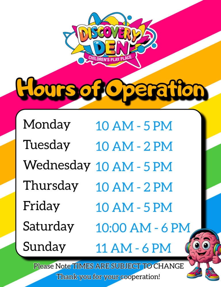 At Discovery Den Children’s Play Place, we’re all about big fun and brainy adventures! We mix hands-on STEM play with wild imagination so kids under 10 can build, explore, and totally rock their world. It’s learning, the fun way — the Discovery Den way!